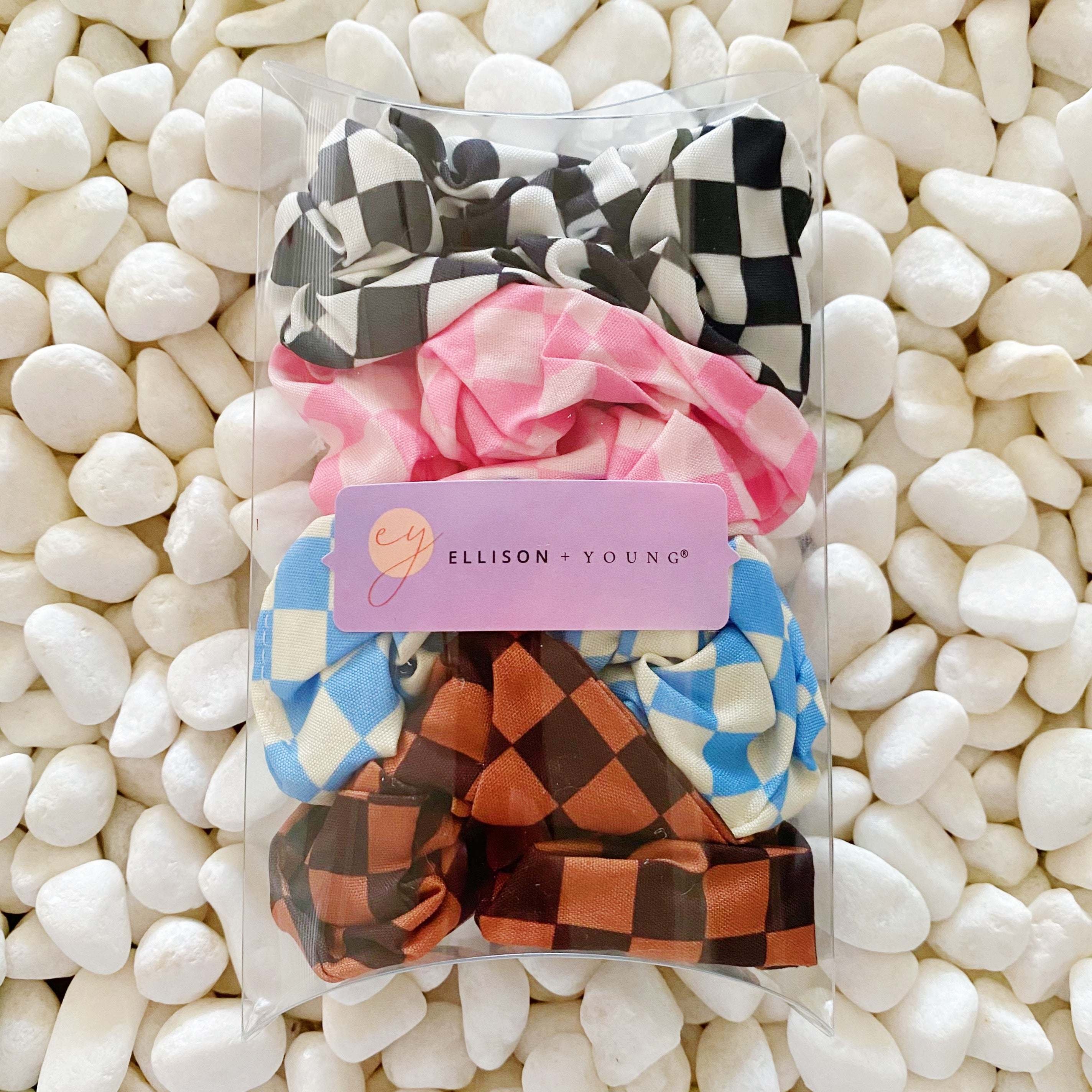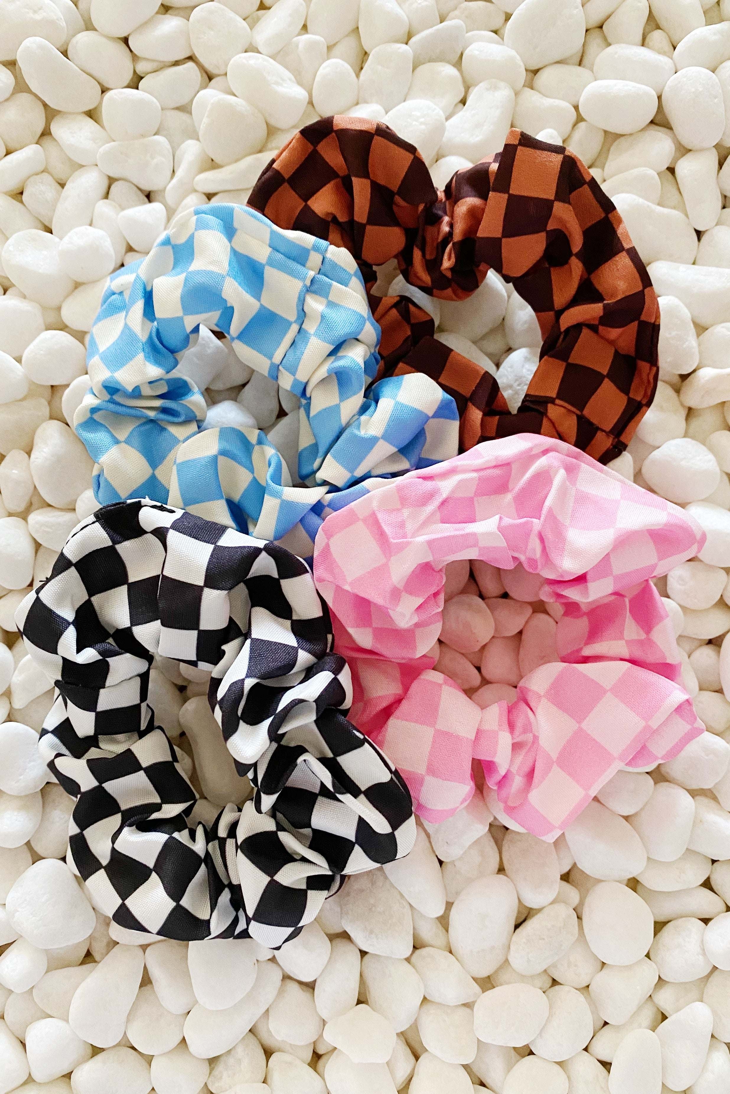 4 scrunches come in this set. Great everyday size scrunches in trendy checkerboard print in carefully picked colors!