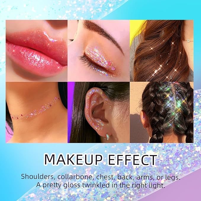 Laser flash powder: this body glitter is made of holographic glitter, which is light and durable. The Color and luster of the laser sequins vary with the angle of view. Make you stand out from the crowd.