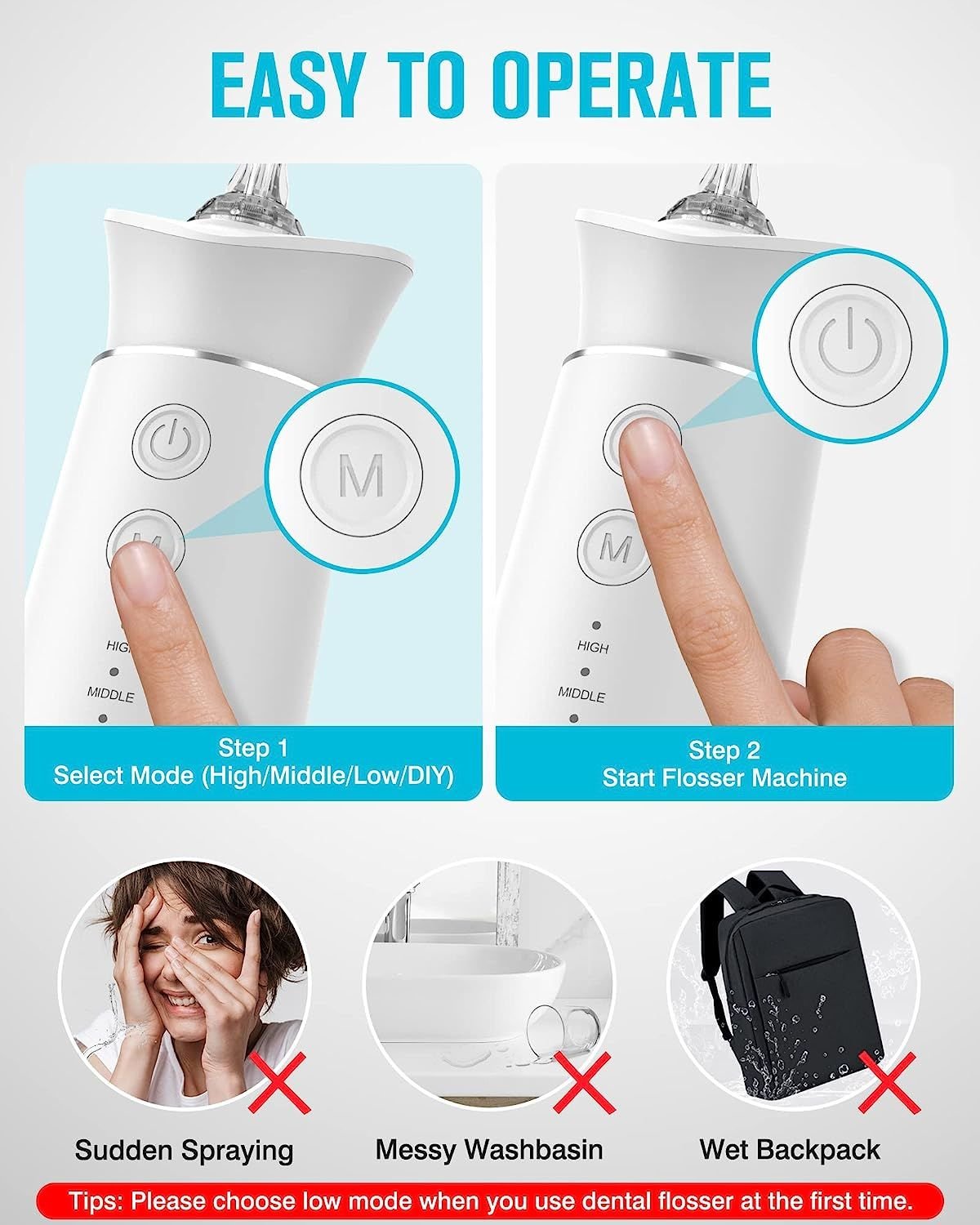 The Dentists' Studies have found that brushing teeth daily is not enough for us to satisfy our oral clean and health. Regular use our Water Dental Flosser helps to remove 99.99% plaque and food stuck between teeth to prevent tooth holes, tooth decay, bleeding gum, bad breath, and even tooth loss. Our Portable Cordless Water Dental Flosser have 7 Modes and 4 jet tips for choosing to meet whole family needs for a variety of uses. Our water dental flosser makes a healthier smile possible.
