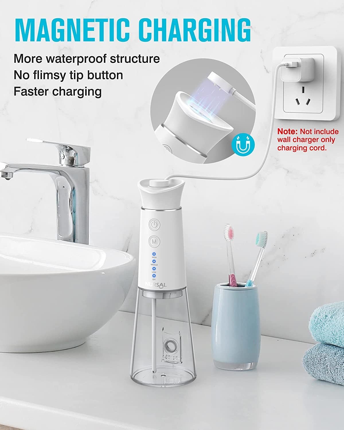 1.ADVANCED Magnetic Charging & POWERFUL BATTERY LIFE: Nursal cordless water dental flosser advanced is magnetic charging and a rechargeable battery. Magnetic charging is faster and more durable than traditional charging. With a powerful and environmental NiMH battery, it can be fully charged in 4 hours and used continuously for about 50 days