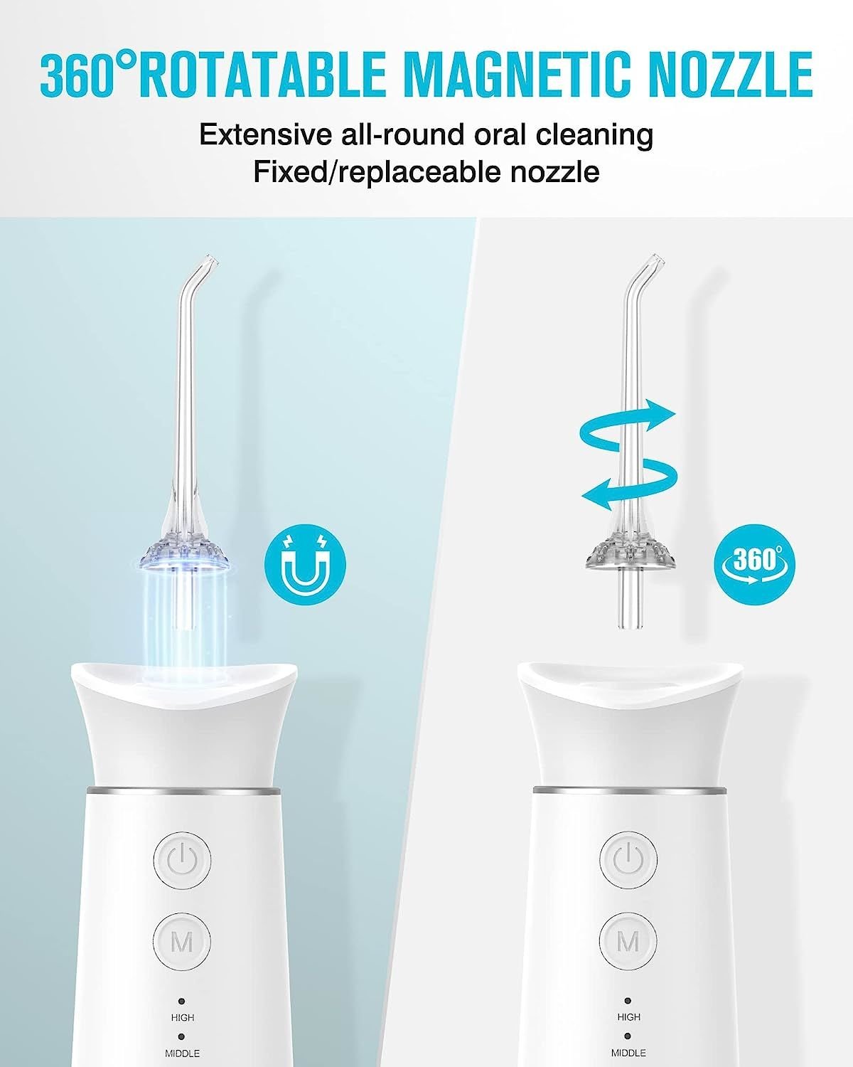 3.360°ROTATABLE & MAGNETIC NOZZLE: Our water dental pick features a 360°rotatable magnetic nozzle that allows you to easily and effectively floss from any angle, cleaning trapped food debris from hard-to-reach areas, which helps with bleeding gums and bad breath. The magnetic tips are very durable, so you never need to worry about the tip’s release button breaking, which is a very common issue for most water flossers